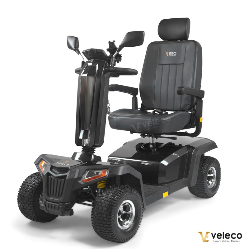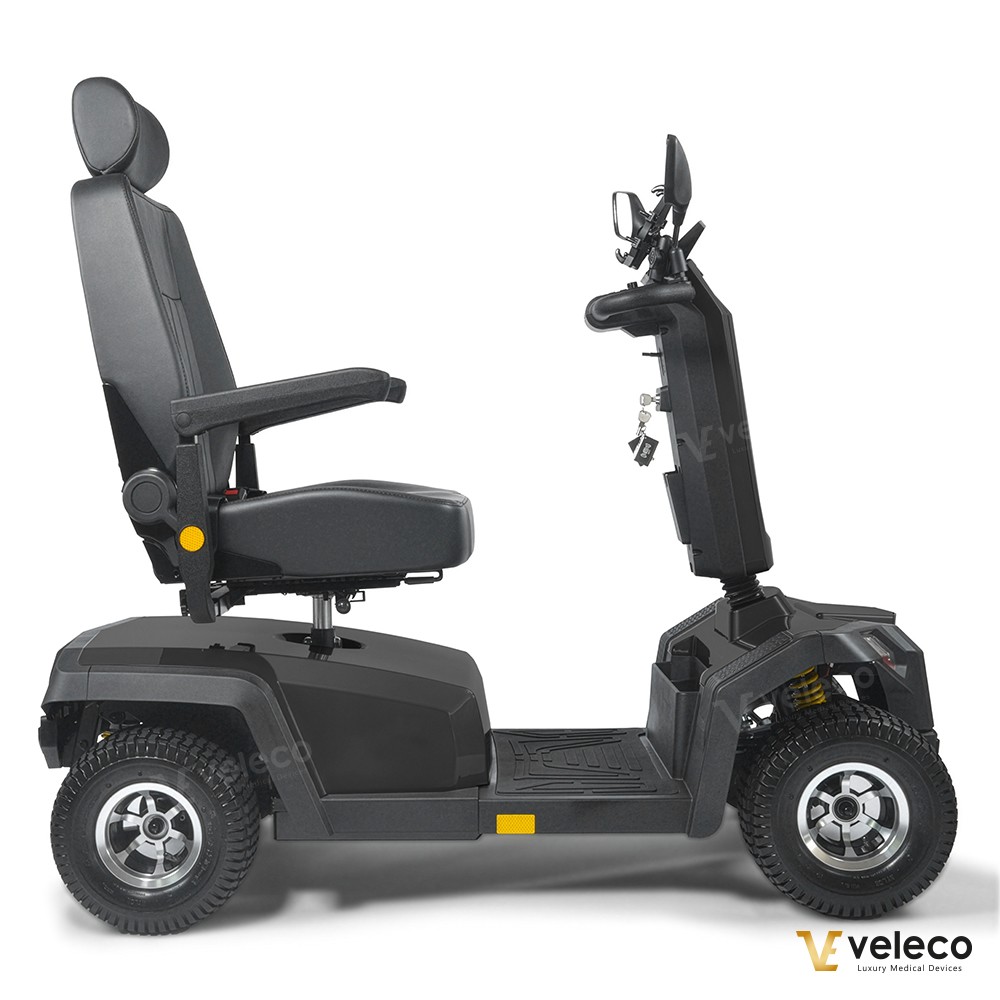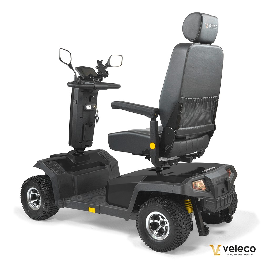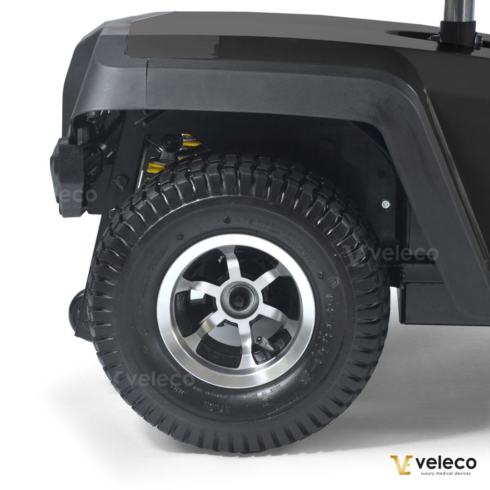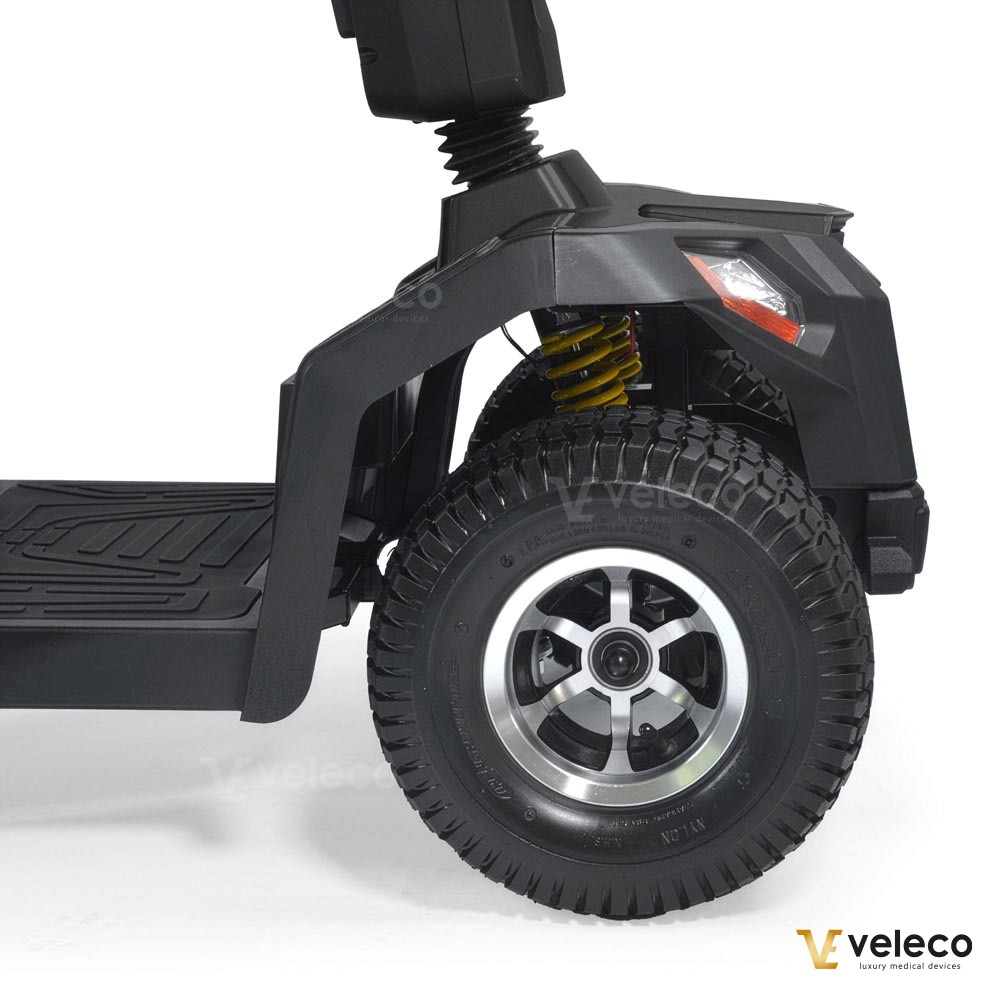 Der Veleco SHARPY PRO ist mit einer Magnetbremse, Sicherheitsgurt, höherem Fahrwerk und größeren Offroad-Reifen für verbesserte Stabilität ausgestattet. Zwei kleine Stützräder sorgen für sichere Fahrten auch auf unebenem Gelände. Für Komfort und Zuverlässigkeit konzipiert, erfüllt dieser Elektrorollstuhl strenge EU-Medizinproduktstandards und trägt stolz das CE-Zeichen – die sichere und verlässliche Wahl für Outdoor-Abenteuer.